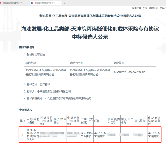江華環(huán)保中標(biāo)中海油丙烯醛催化劑載體采購項(xiàng)目