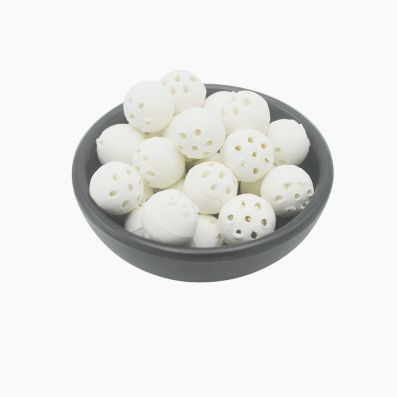 開孔瓷球外觀為白色球體,開孔互相垂直,開孔數(shù)量可以根據(jù)實際使用需要和瓷球的尺寸大小開單孔、三孔、五孔及七孔。