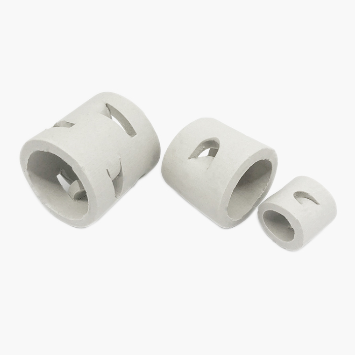 陶瓷鮑爾環(huán)填料是在陶瓷拉西環(huán)的基礎(chǔ)上開發(fā)的一種高徑相等的開孔環(huán)型填料,每層窗孔有5個(gè)舌葉,每個(gè)舌葉內(nèi)彎指向環(huán)心,上下兩層窗孔的位置相反錯(cuò)開,一般開孔面積約占環(huán)壁總面積的30%左右,使得填料塔內(nèi)的氣體和液體能夠從窗孔自由通過,改善了氣液分布,充分利用了環(huán)的內(nèi)表面。