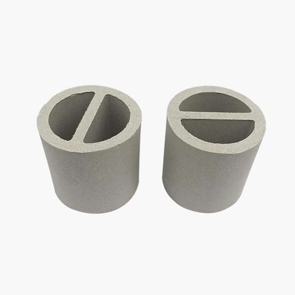 陶瓷一字環(huán)又被稱之為陶瓷勒辛環(huán)。它是在拉西環(huán)原有基礎(chǔ)上基于增加填料的比表 面積和強(qiáng)化傳質(zhì)效率的想法之上在其中間加入像漢字一的一般的隔板而設(shè)計出來的。形象化地稱它為一字環(huán)。陶瓷一字環(huán)是由陶瓷拉西環(huán)改良形成,比陶瓷拉西環(huán)有更大比表面積和更好的抗壓強(qiáng)度,擁有優(yōu)異的耐酸和耐熱性,能夠并且能耐除氫氟酸以外的各種無機(jī)酸、有機(jī)酸及有機(jī)溶劑的腐蝕,并能夠在高溫或者低溫的環(huán)境下使用,因此其使用范圍非常廣泛。