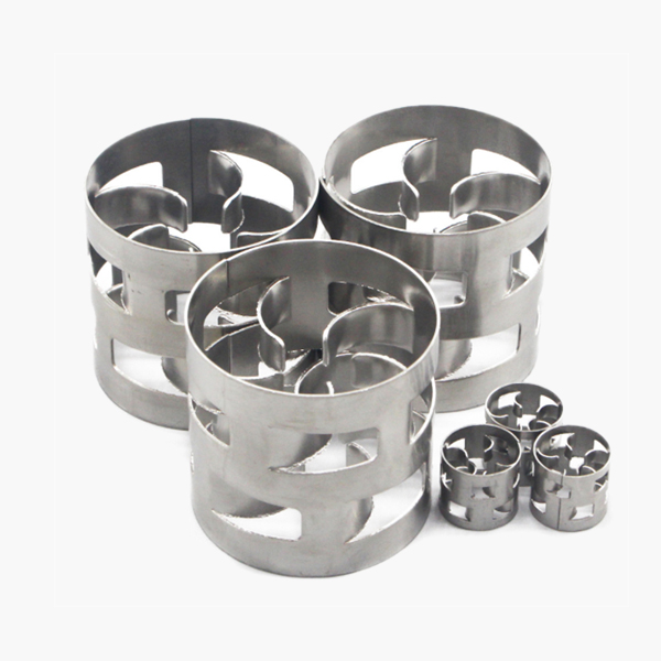 金屬鮑爾環(huán)填料是采用金屬薄板沖制而成,在環(huán)壁上開出了兩排帶有內(nèi)伸舌葉的窗孔。每排窗孔有五個(gè)舌葉,每個(gè)舌葉彎向環(huán)內(nèi),指向環(huán)心,在中心處幾乎相搭,上下兩層窗孔的位置相互錯(cuò)開,一般開孔的總面積約為整個(gè)環(huán)壁面積的35%左右,由于鮑爾環(huán)填料在環(huán)壁上開了許多窗孔,使得塔內(nèi)的氣體和液體能夠從窗口自由通過,目前鮑爾環(huán)填料是被采用的主要環(huán)形填料之一。