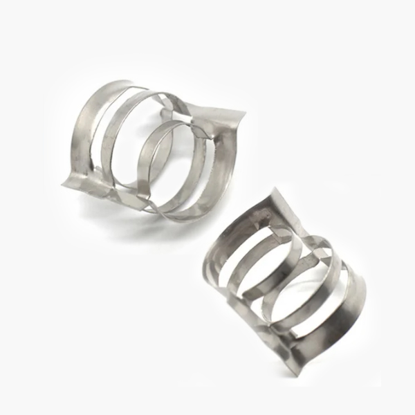 金屬共軛環(huán)填料揉合了環(huán)形和鞍形填料的優(yōu)點,采用共軛曲線肋片相結構,兩端外卷邊及合適的長徑比、填料間或填料于踏壁間均為點接觸,不會產(chǎn)生疊套、孔隙均勻、阻力小、亂堆時取定向排列,故有規(guī)整填料的特點,有較好的流體力學和傳質(zhì)性能。